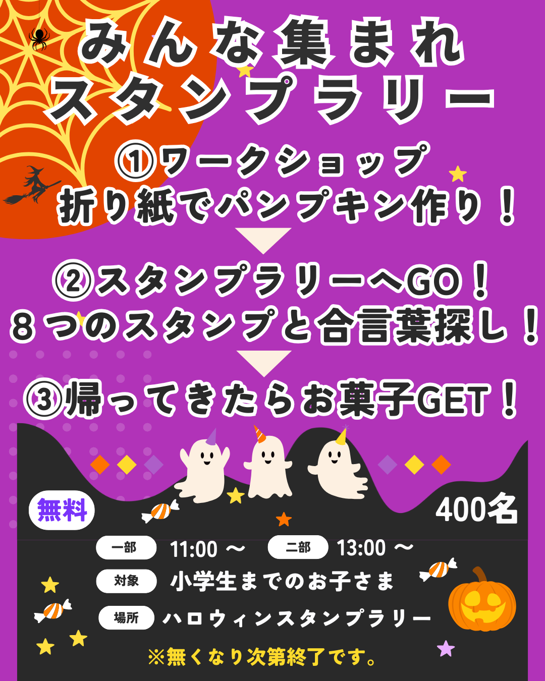 ●みんな集まれスタンプラリー ハロウィン工作/パンプキンを作ってスタンプラリーへ出発! 【無料】小学生まで。詳細はコチラ ●Together Art ワンポイントアート/ハロウィンペイントアート体験サービス! 詳細はコチラ!